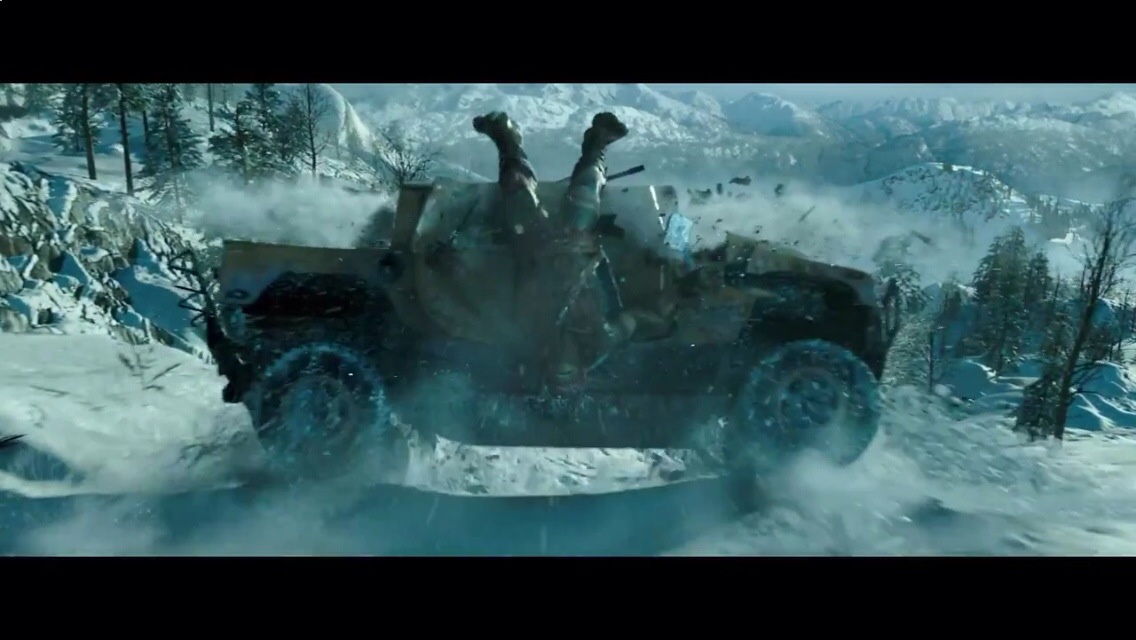 There’s also a sequence of the Turtles sliding down a snowy mountain while being chased.  I’m not sure where this is supposed to be, as there aren’t any snow-capped mountains in NYC, but perhaps Splinter took them on a field trip.  One of the Turtles has an unfortunate encounter with a Hummer, perhaps indicating that the Turtles will come face to face with the military in the film.  (It’s not a Michael Bay film without the military.)  I think this is Raphael, because I think I see a sai, but I can’t be sure.