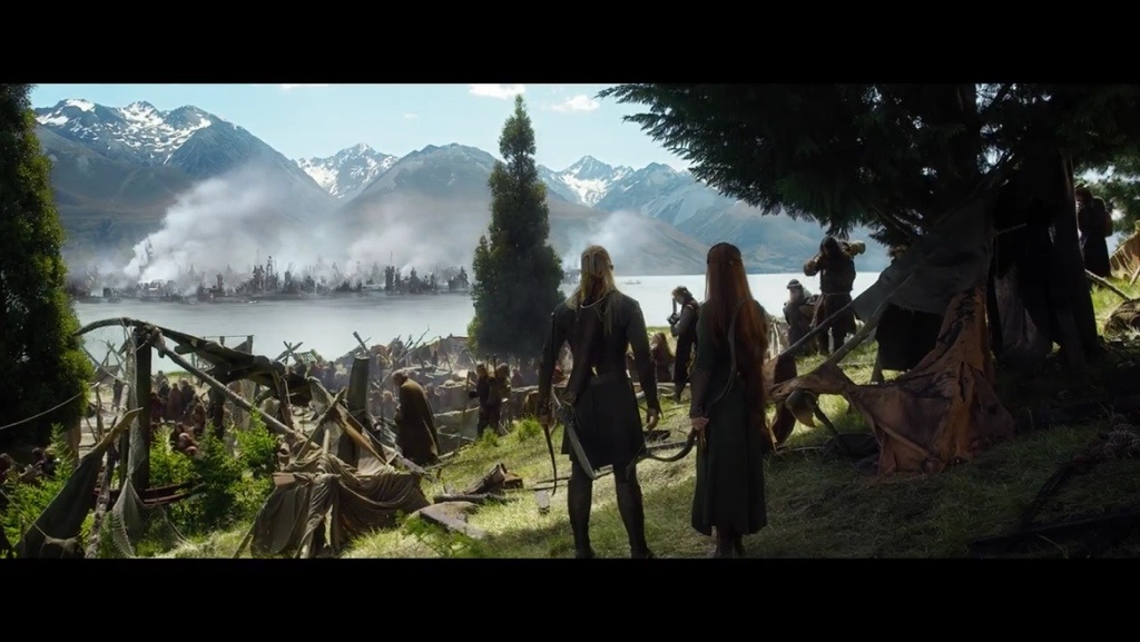 We also get a glimpse at the aftermath of the town’s destruction, as Legolas and Tauriel watch from a distance, surrounded by what I assume are refugees.