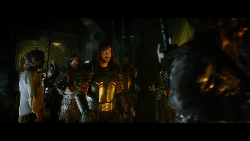 We also see the Dwarves getting armored for battle, with Kili looking particularly grim.
