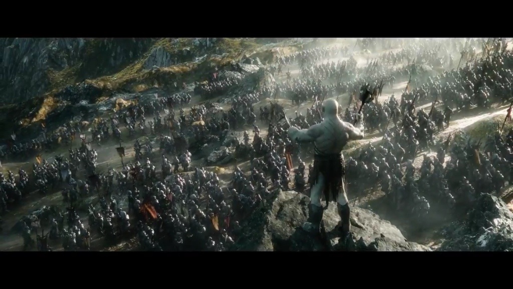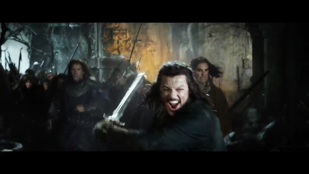 Thorin, always the calm, resonable one, replies, “I will have war.” The “and you will have none of my gold” is implied. As the battle looms, the trailer gives us a sequence of quick shots showing off the scale of the conflict and the action: