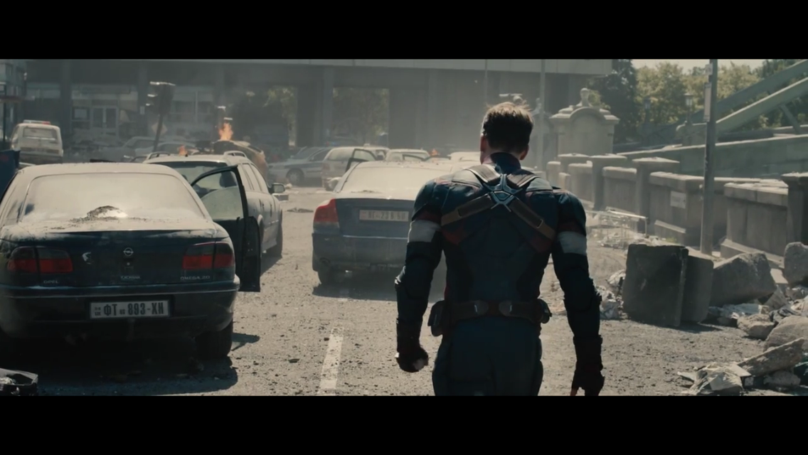 The music has continued through all of this, but as the child’s voice sings “I had strings,” Ultron joins on on the line, “But now I’m free.” We see Captain America running from a car that’s been knocked into the air.