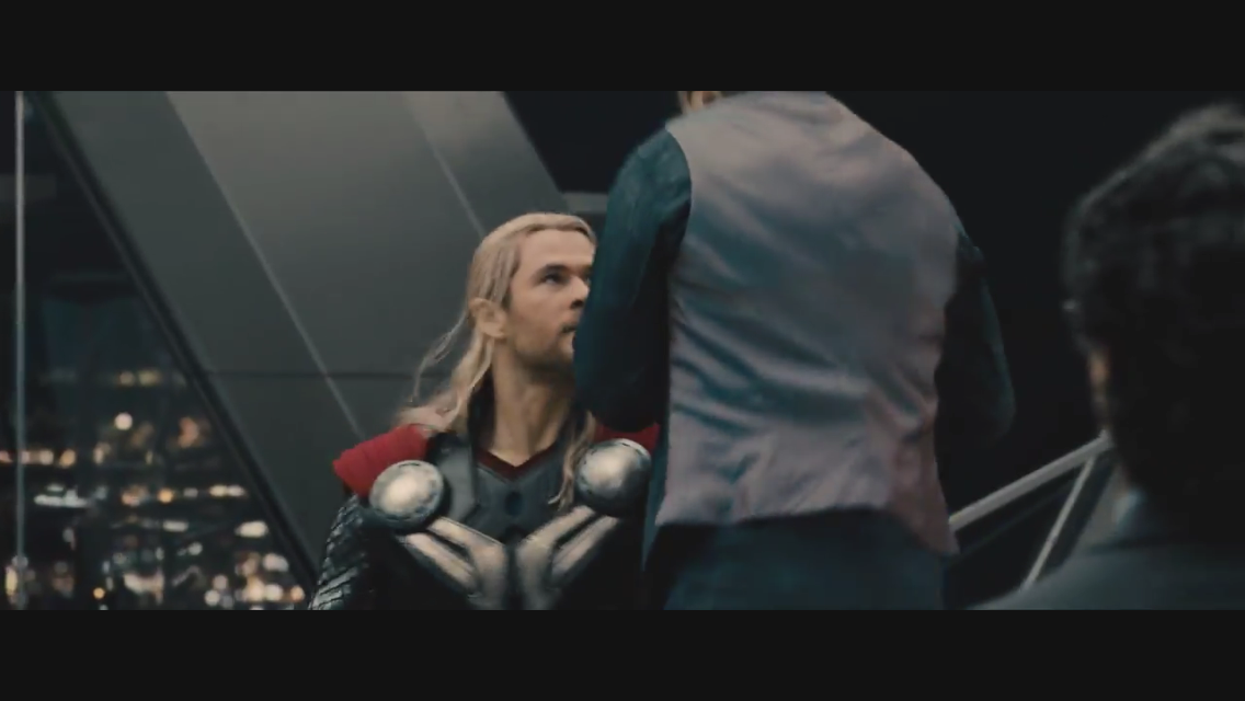 The group is clearly alarmed by this. They appear to be sitting around in their civilian clothes in Stark Tower (now called Avengers Tower?). They almost look like they’ve been having a party. Some of them are dressed up, there are bottles of booze and wine glasses scattered around the room. Also, notice that in addition to Thor, Rogers and Banner, we’ve got a glimpse of James Rhodes (aka Rhodey aka War Machine) making his first appearance in an Avengers movie after three Iron Man films.