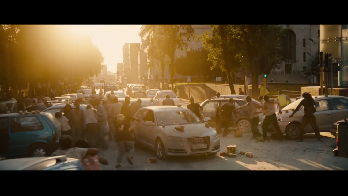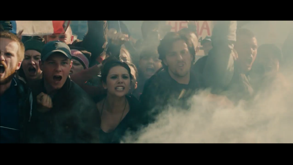 “Everyone screaming,” he continues, as we see people shouting. What’s interesting here is that they seem to be shouting as some sort of protest, given the placards in the background. It doesn’t look like fear on their faces, but anger.
