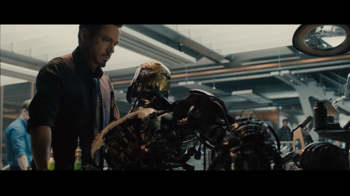 We get a quick shot of Natasha looking scared and backing away from something. She appears to be in the same automated factory where we earlier saw Quicksilver, Scarlet Witch, and either Ultron or Vision.