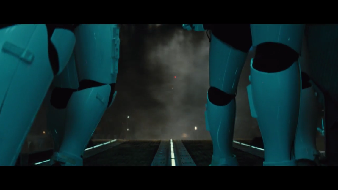 We obviously can’t tell where they’re headed. Perhaps they’re after John Boyega, or some of the other characters we see in the trailer. This is the first real sense we get that George Lucas is not in the director’s chair and J. J. Abrams is. It’s dark, the lighting is completely different, and it’s just unlike anything Lucas would have given us. We can imagine that the Empire is in tatters following the battle of Endor in Return of the Jedi, but you’d think they could at least replace flickering lightbulbs in their transports. (That was the beginning and the end of any and all snark in this analysis.)