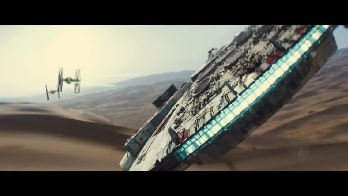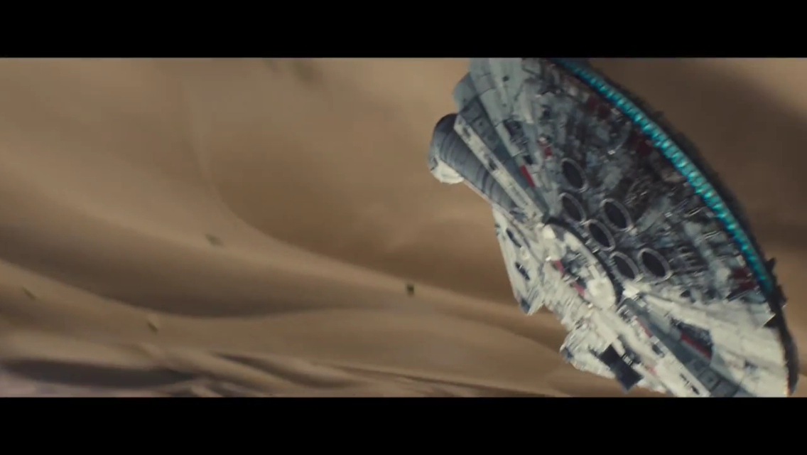 If you’re curious, this was the moment when I completely lost it watching the trailer. It’s a gorgeous, modern, spectacular shot of our heroes’ ship. I’m sure we all assume that Han and Chewie are at the controls, with Leia beside them, C-3PO screaming in the back, while R2-D2 tries to keep the ship flying. Even if that’s not the case, seeing the Millennium Falcon flying around looking stunning while John Williams’ opening fanfare plays is a moment that will take your breath away. You know those TIE fighters don’t stand a chance.