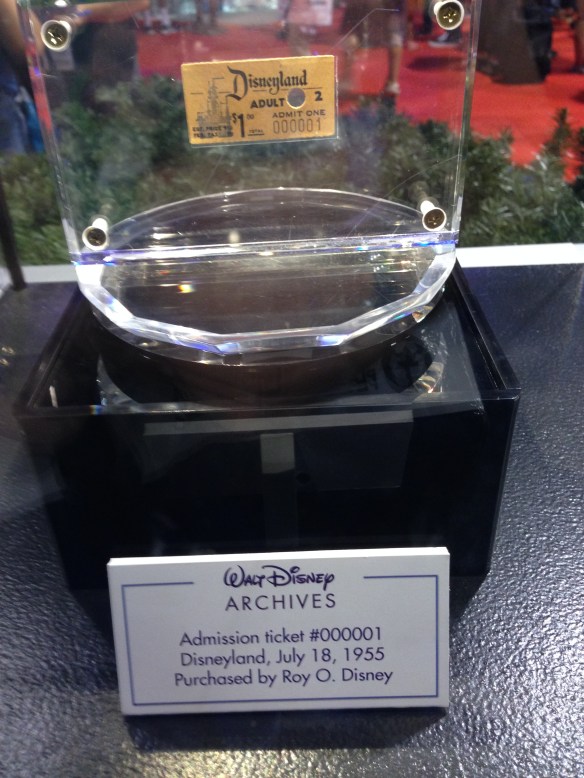 The Exhibit, presented by the Walt Disney Archives and centered around Disneyland’s 60th anniversary, was full of historical artifacts, interesting stories, pre-construction artwork, ride vehicles, costumes, props, signs and more. I’m going to let the pictures below speak for themselves, but I’ll point out a few of my highlights first. It’s very poignant to see the very first Disneyland ticket ever sold on display, particularly tucked away so innoccuously in a corner of the pavilion. It was really neat to see a selection of ride vehicles side by side and out of context; it really makes you take another look at something you’re so used to being just a part of a larger ride. I geeked out over the Star Tours sign and Captain Rex animatronic. They also had a virtual recreation of the Adventure Thru Inner Space ride which was very popular. Everything had very detailed histories and descriptions, and I completely lost track of how long I was in there, despite it not being as large as you might suspect.