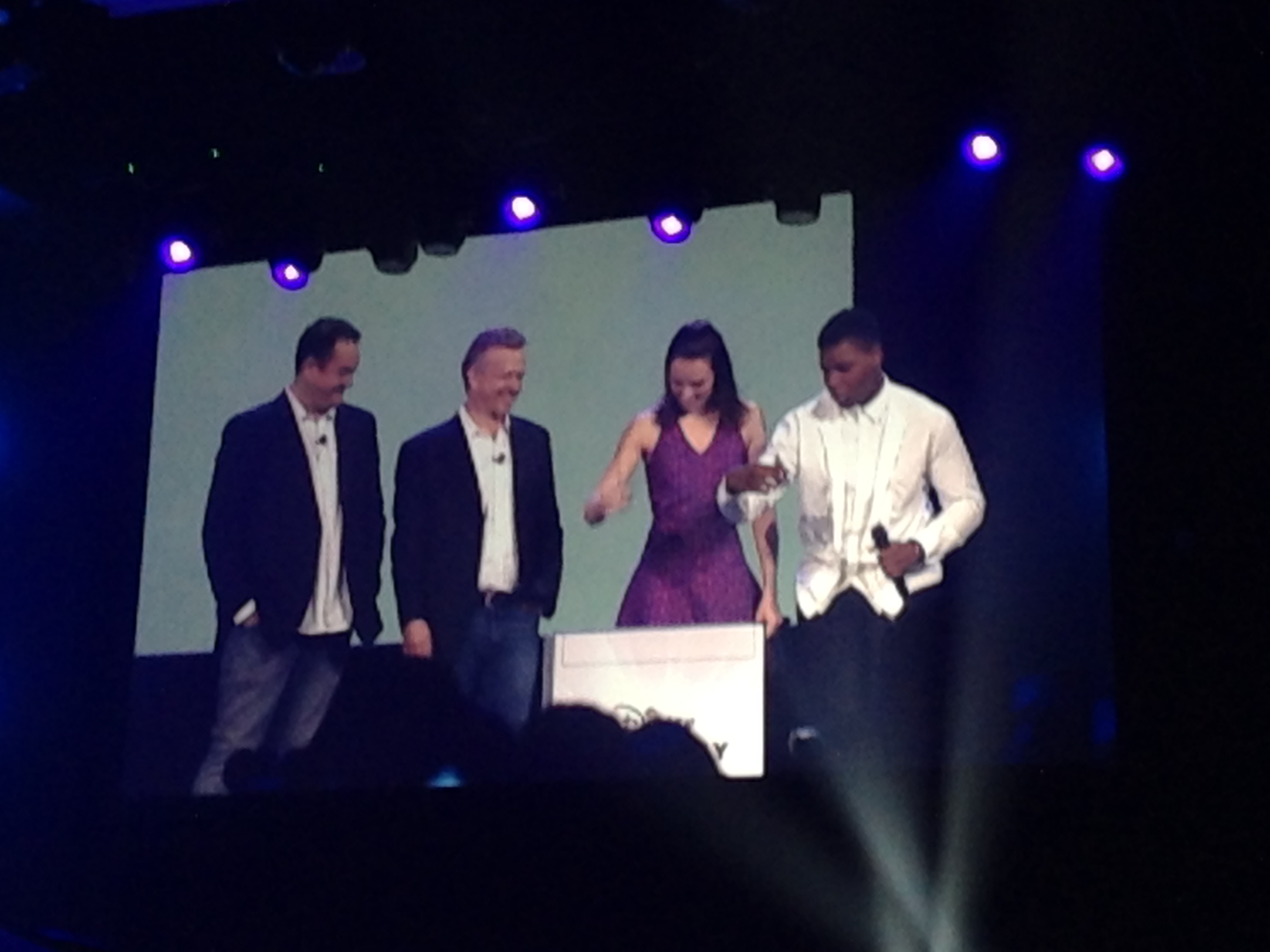 What I really wanted to see was Disney Infinity 3.0, and it certainly didn’t disappoint. The game’s producers appeared onstage to talk about some of the upgrades and improvements. They pointed out that the starter pack includes Ahsoka intentionally, as they want to keep a focus on strong female characters in the game. Newly announced was the title for the 3.0 Marvel playset titled Marvel Battlegrounds, which features fighter gameplay a la Mortal Kombat and can support 4 person multiplayer as well as every Marvel character released for the series thus far. They revealed that Disney World Magic Bands will unlock the Partners Statue from the Disney Parks, which is just a small part of the expansive new parks-related content in the game. Four new characters were revealed: Peter Pan (chosen by the Toy Box Summit participants), Spot from The Good Dinosaur, and Judy and Nick from Zootopia. We learned that the ultimate unlock for having all of the figures would be the Keyblade from the Kingdom Hearts series, and keeping with that tie-in we were told that we would all be getting not only the Micky Mouse figure but an exclusive, D23 Expo-only power disc which will turn Mickey into his King Mickey character from Kingdom Hearts. Finally, we were given our first look at the figures for Finn and Rey from The Force Awakens, and John Boyega and Daisy Ridley came out onstage for the moment. They then proceeded to sign the two figures and give them to a couple of cute kids in costume in the audience.