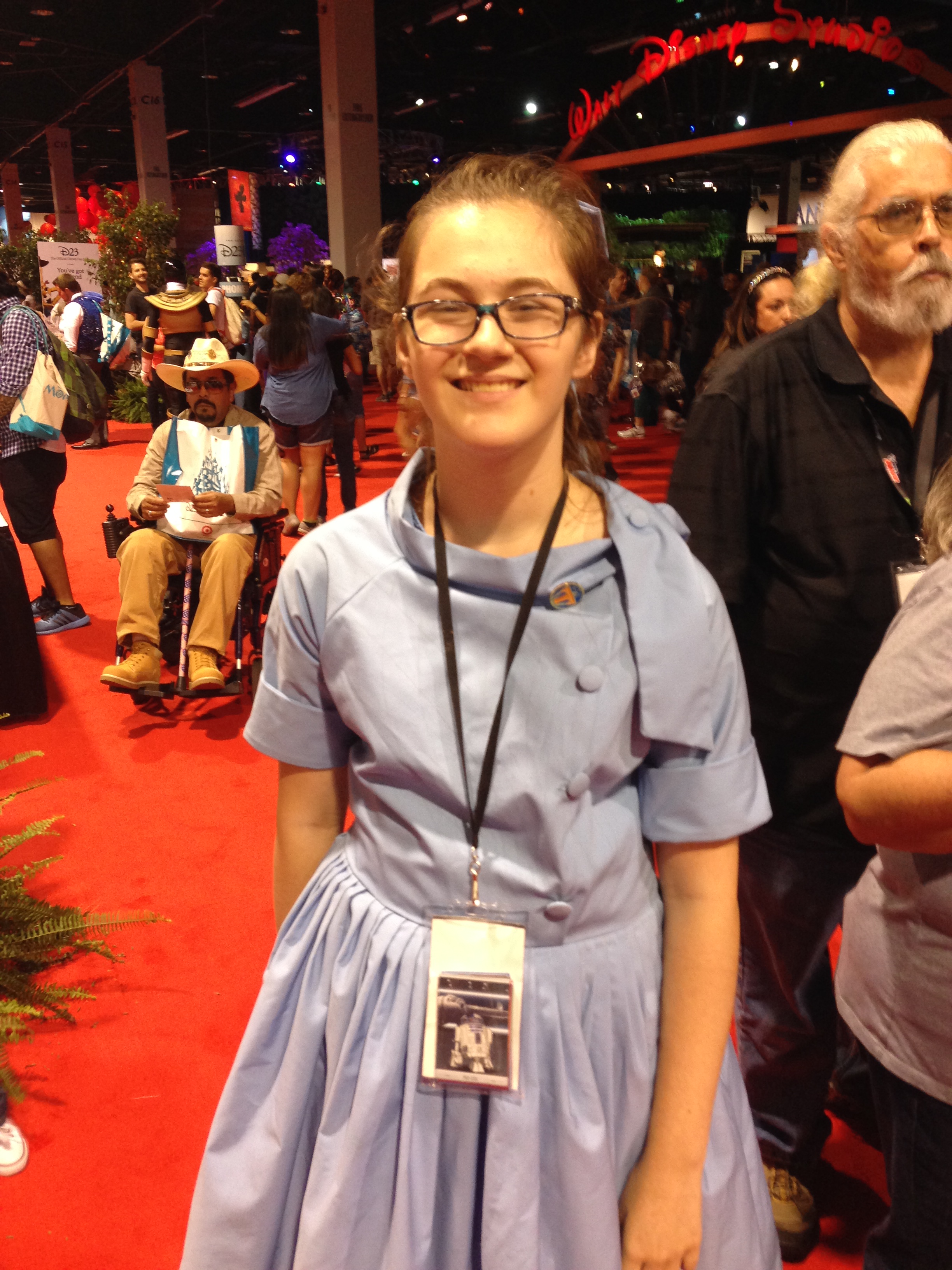 I spent the rest of my time wandering the exhibits and demonstrations, watching some and participating in others. There were plenty of photo opportunities, smaller displays of artwork or production information, and little things to see and do. Every corner of the building was crammed with something worth exploring, but it was also filled with many fun and interesting people worth talking to. There was a large amount of cosplay going on all weekend, but I saw my three favorite pieces today. First up was a girl dressed as Athena from Tomorrowland, my favorite film of the year. Tomorrowland was almost nonexistent at the Expo, but I had many people ask me where I got my pins, and I did find one green screen photo-op that had a Tomorrowland option (for which I was conveniently wearing my Tomorrowland/Plus Ultra shirt). I promise this will be the last picture with me in it.