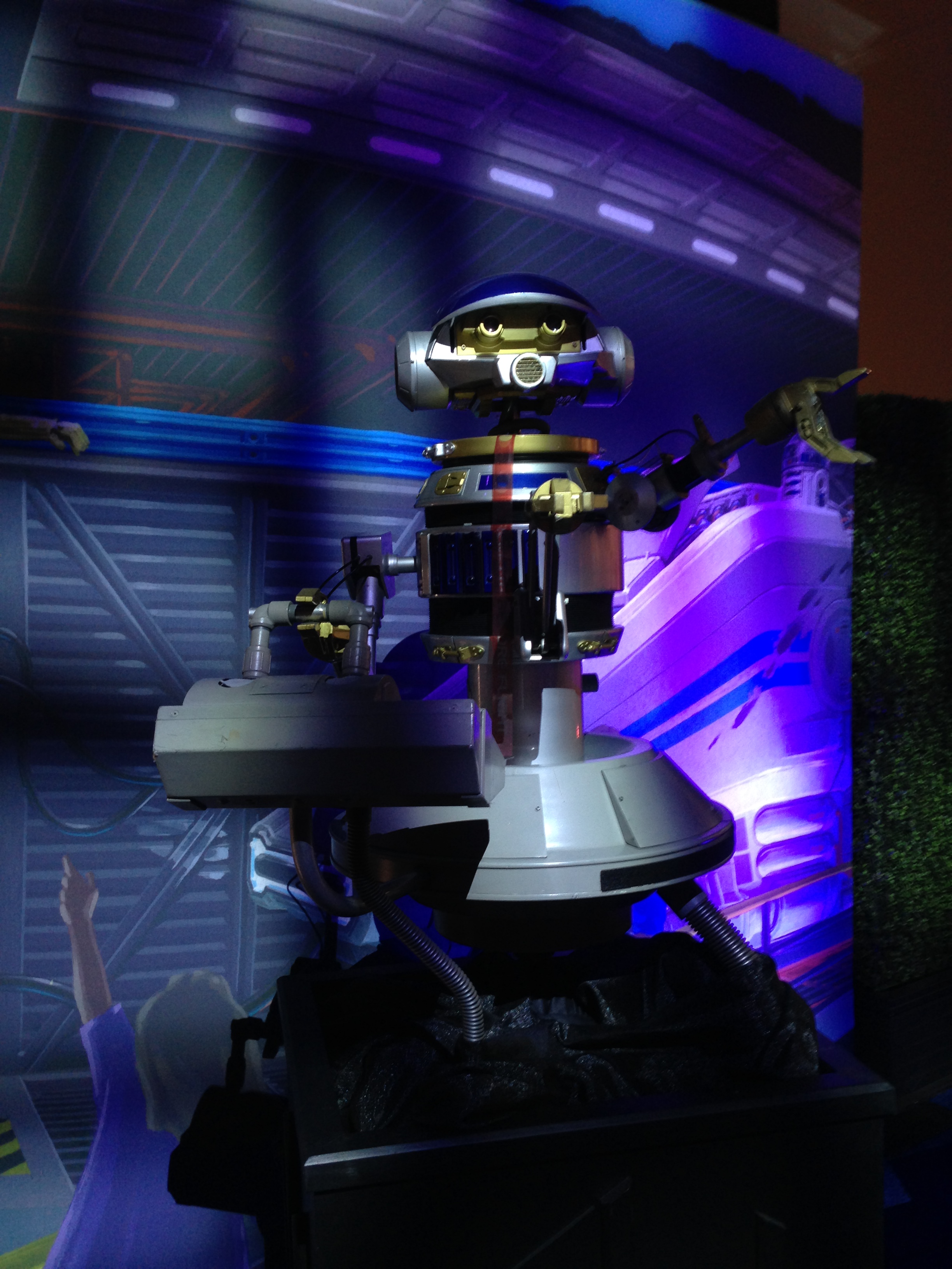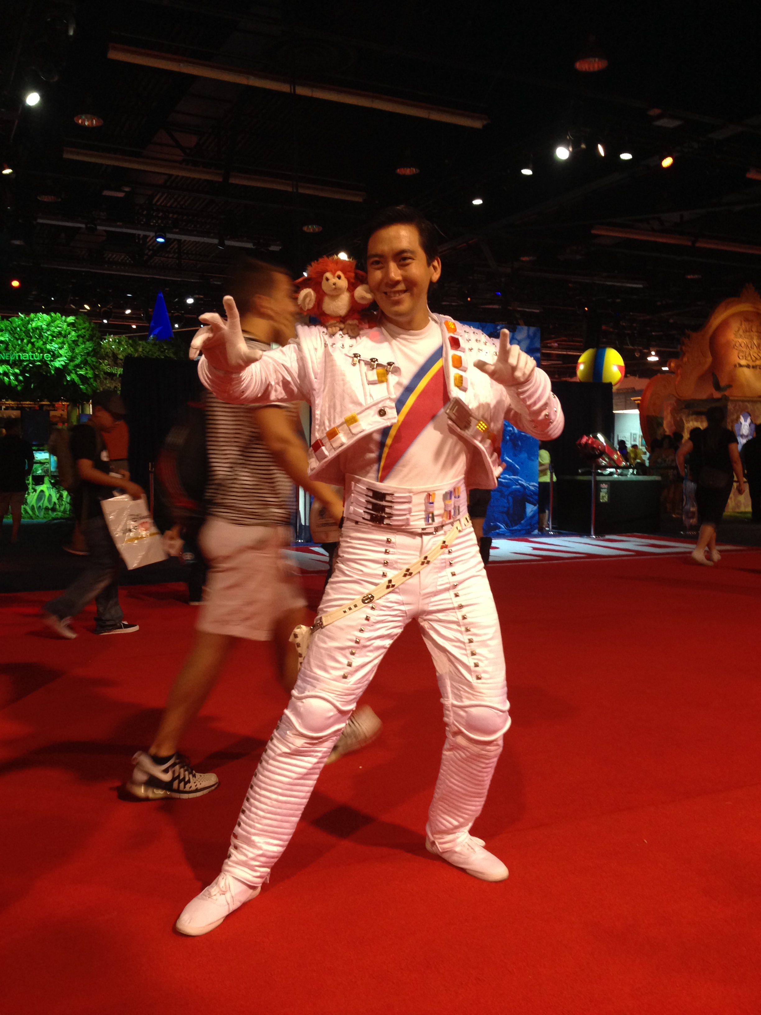 And finally, at the end of the day, I sat on a bench to take a rest because I was exhausted, and it turned out to be perhaps my best decision of the Expo. I had read many articles giving advice for newbies before I came, and they all mentioned how many great friends you’ll make at the Expo, whether in line or simply wandering around. Well with an hour left in the Expo I had made no friends, as most people in the lines were content to merely play on their phones for four hours rather than talking, and those who did want to talk always seemed to be two rows over or just far enough away to make it awkward to try to socialize. But after a few minutes of sitting on this bench, a lady sat down next to me, and we started chatting. It turns out she’s a blogger too (aprilgolightly.com) whom Disney had actually flown to the Expo to cover the goings on. We talked, we commiserated over our aching feet, and by the end were exchanging contact info. But that was only half of what the lucky bench had planned for me, because just as I was getting ready to get back on my feet, the best cosplayer of the Expo went wandering by, dressed as none other than Captain Eo, complete with Fuzzball on his shoulder. Captain Eo is my all-time favorite Disney attraction, and I’ve already related how much Michael Jackson meant to me personally. The guy’s costume was spectacular, with every detail perfect, including the blinking pattern of lights on his jacket. It was a fitting way to close out the weekend, one that I’ll definitely remember forever.