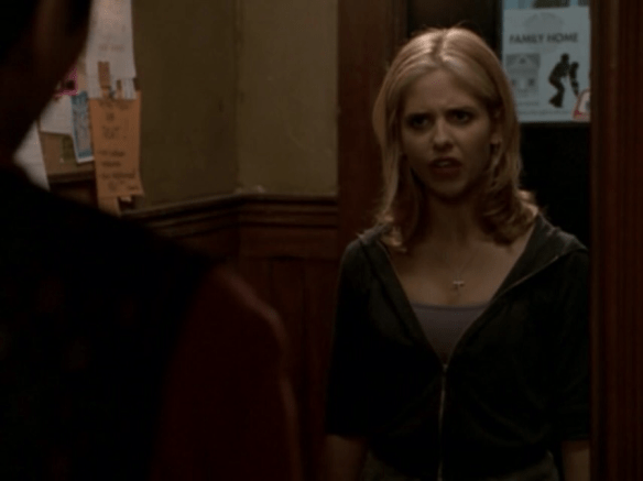 Buffy: You know, I just… I woke up this morning and I looked in the mirror and I thought, “Hey, what’s with all the sin? I need to change. I’m… I’m dirty. I’m, I’m bad with the… sex and the envy and that, that loud music us kids listen to nowadays. W—” … Oh, I just suck at undercover.